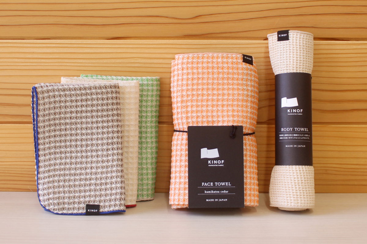 KINOF is a fabric brand from Kamikatsu, Tokushima. Kamikatsu is a small, mountain town with plenty of tree-covered mountains and flowing water. Fabric made from thinned cedar trees is used to make household items like towels and sponges. This natural fabric has a light touch similar to linen, with a smooth texture that dries quickly. It’s suitable for areas with high humidity, and gets even fluffier with each washing. The KINOF project continues developing products that bring people closer to nature.